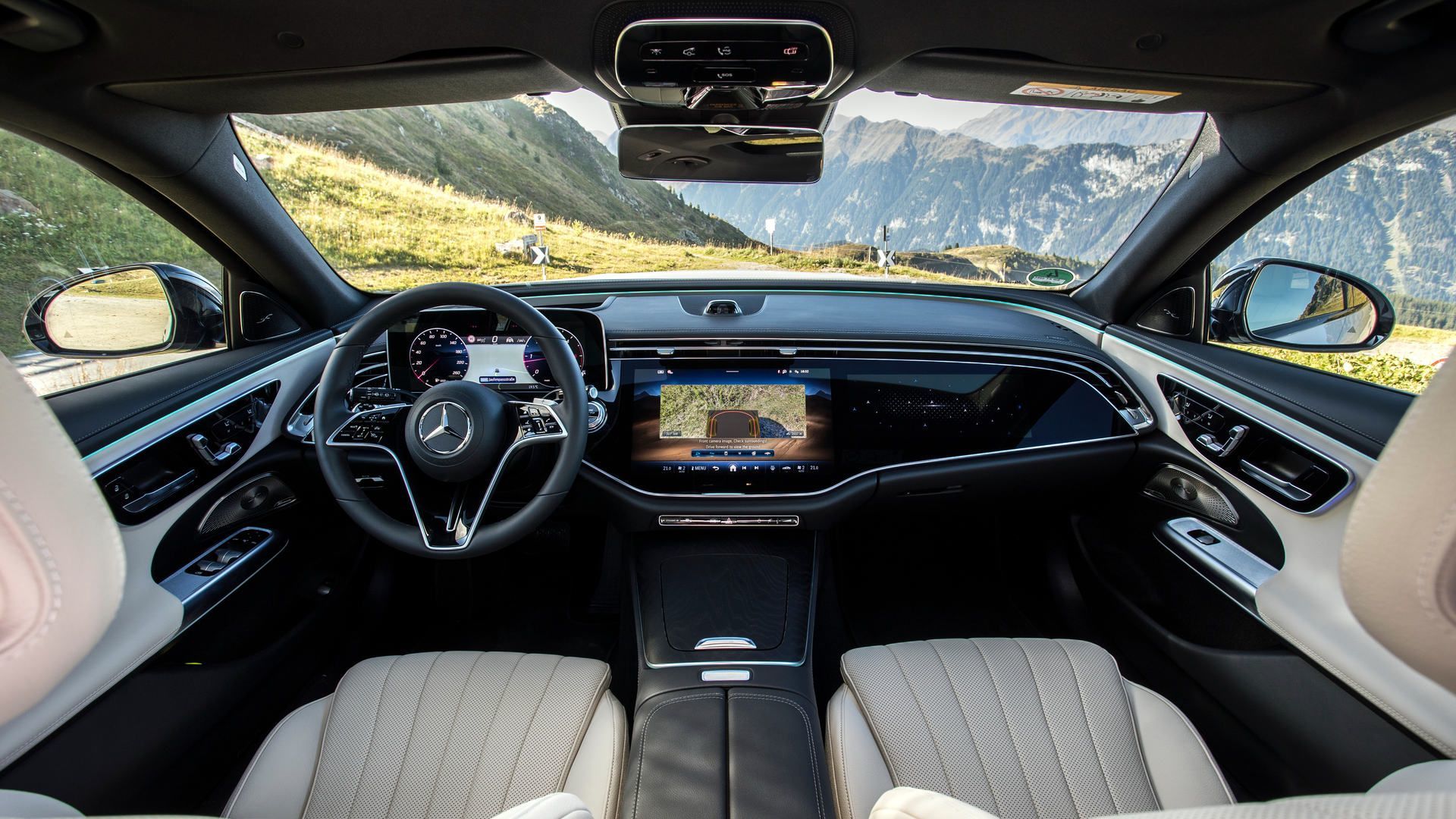 The E 450 All-Terrain includes the latest generation MBUX infotainment system with voice control, touchscreen operation, and smartphone integration for Apple CarPlay and Android Auto. Navigation with Electric Intelligence calculates efficient routes accounting for terrain and weather conditions.